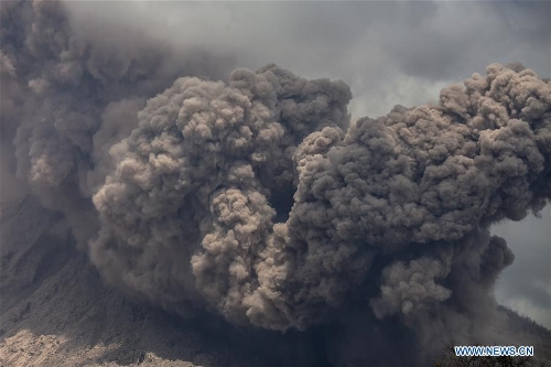 Photo taken on Feb. 24, 2016 shows volcanic smoking and ashes rising from Mount Sinabung during an eruption in Karo, North Sumatra, Indonesia. Authorities have repeatedly called on local residents to remain patient in dealing with the impact of Sinabung's eruptions, which some experts have predicted will continue for five more years. (Xinhua/YT Haryanto)
