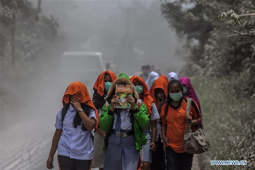 Indonesian students wear masks during an eruption of Mount Sinabung in Karo, North Sumatra, Indonesia, Feb. 24, 2016. Authorities have repeatedly called on local residents to remain patient in dealing with the impact of Sinabung's eruptions, which some experts have predicted will continue for five more years. (Xinhua/YT Haryanto)