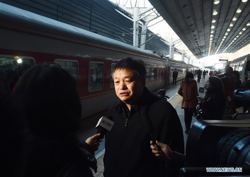 BEIJING, March 2, 2016 (Xinhua) -- Guo Bingsheng, a deputy to the 12th National People's Congress (NPC) from north China's Inner Mongolia Autonomous Region, receives an interview upon his arrival at Beijing West Railway Station in Beijing, capital of China, March 2, 2016. The fourth annual session of the 12th NPC will open on March 5. (Xinhua/Jin Liangkuai)