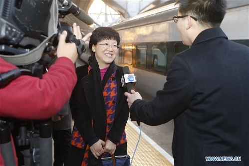 BEIJING, March 2, 2016 (Xinhua) -- Su Yanxia, a deputy to the 12th National People's Congress (NPC) from northeast China's Heilongjiang Province, receives an interview upon her arrival at Beijing Railway Station in Beijing, capital of China, March 2, 2016. The fourth annual session of the 12th NPC will open on March 5. (Xinhua/Lyv Xun)