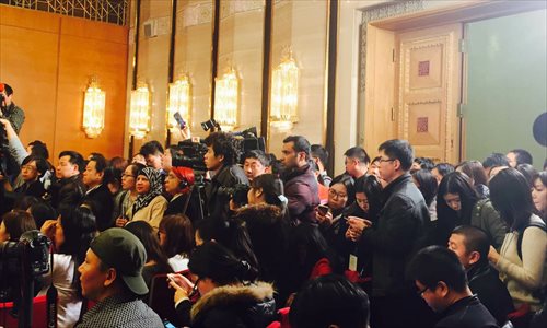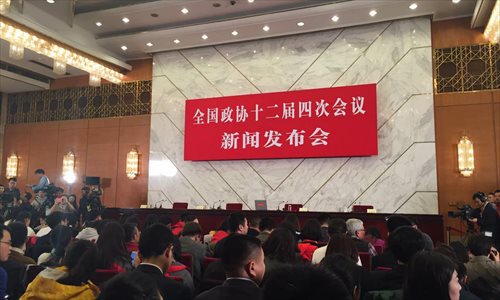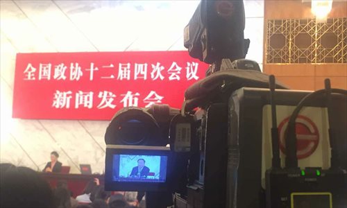 Wang Guoqing, Vice Chairman of the Foreign Affairs Committee of the National Committee of the Chinese People's Political Consultative Conference (CPPCC), speaks at the press conference of the Fourth Session of the 12th CPPCC National Committee at the Great Hall of the People in Beijing, capital of China, March 2, 2016. Photo: Fan Lingzhi/GT
