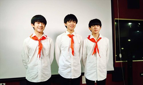 Pop band TFboys wear red scarves in a CCYL video. Photo: Courtesy of Baidu
