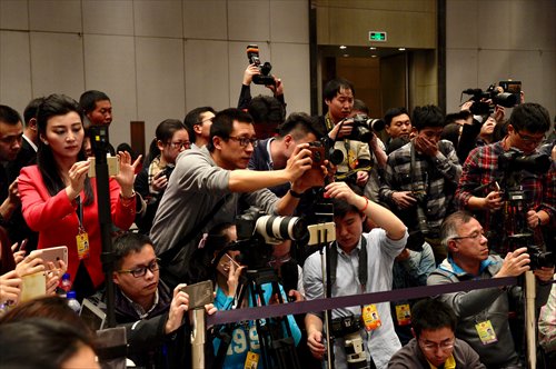 Reporters gather at a press meeting with Pony Ma Huateng, chairman of Tencent Holdings, on Thursday. Ma is a member of the National People's Congress, the nation's top legislature, and his proposal this year is related to the development of the Internet. Photo: CFP