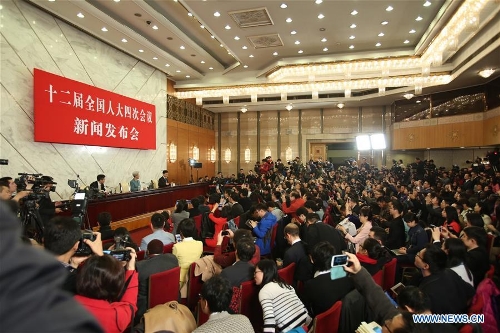 BEIJING, March 4, 2016 (Xinhua) -- The press conference on the fourth session of China's 12th National People's Congress (NPC) is held at the Great Hall of the People in Beijing, capital of China, March 4, 2016. The fourth session of the 12th NPC is scheduled to open in Beijing on March 5. (Xinhua/Zhang Cheng)