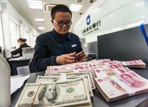 An employee counts bank notes at a bank in Hai'an, East China's Jiangsu Province on March 1, 2016. Photo: CFP