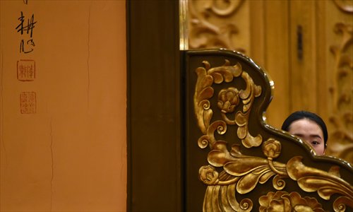 An attendant watches behind a screen during the opening session of the Xinjiang Uyghur Autonomous Region as part of the fourth Session of the 12th National People's Congress at the Great Hall of the People in Beijing on Tuesday. Photo: AFP