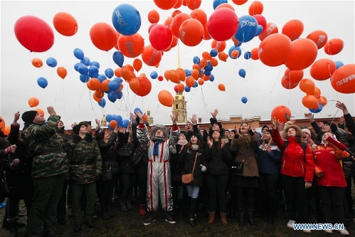 People hold red balloons with the name of Yuri Gargarin during an activity to celebrate Yuri Gargarin's 82nd birthday in St. Petersburg, Russia, on March 9, 2016. The late cosmonaut Yuri Gagarin became the first person in space on April 12, 1961 and was killed in 1968 at age of 34 in a plane crash. He sould have been 82 years old on Wednesday. (Xinhua)