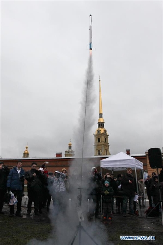 A mini-rocket lifts off during an activity to celebrate Yuri Gargarin's 82nd birthday in St. Petersburg, Russia, on March 9, 2016. The late cosmonaut Yuri Gagarin became the first person in space on April 12, 1961 and was killed in 1968 at age of 34 in a plane crash. He sould have been 82 years old on Wednesday. (Xinhua)