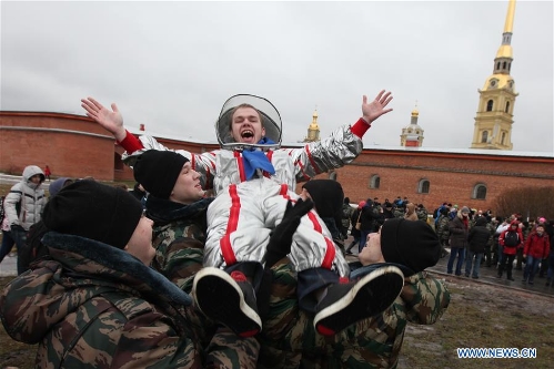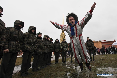 People participate in an activity to celebrate Yuri Gargarin's 82nd birthday in St. Petersburg, Russia, on March 9, 2016. The late cosmonaut Yuri Gagarin became the first person in space on April 12, 1961 and was killed in 1968 at age of 34 in a plane crash. He sould have been 82 years old on Wednesday. (Xinhua)