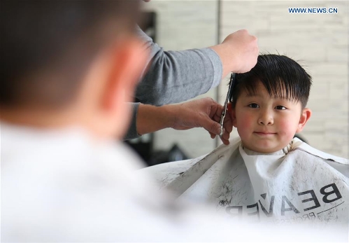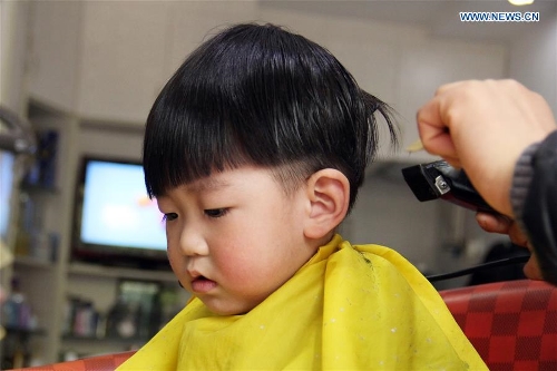 A child has his hair cut at a barbershop at the Longtaitou Festival in Changzhou City, east China's Jiangsu Province, March 10, 2016. The Longtaitou Festival, or Eryueer Festival, which means "dragon raises head" in Chinese, is a traditional Chinese festival held on the second day of the second month in the Chinese lunar calendar. (Xinhua/Chen Wei)