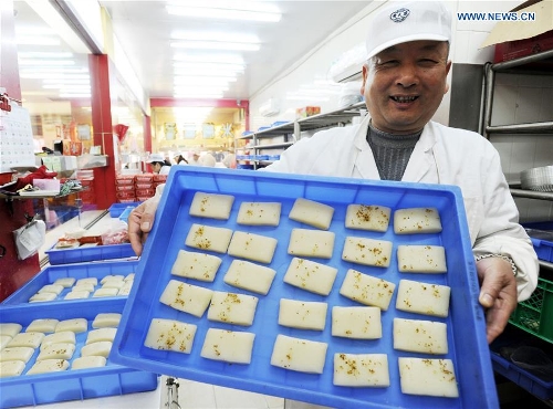 A staff member shows traditional rice cakes at the Longtaitou Festival in Suzhou, east China's Jiangsu Province, March 10, 2016. Local residents have a tradition to eat rice cakes at the Longtaitou Festival. The Longtaitou Festival, or Eryueer Festival, which means "dragon raises head" in Chinese, is a traditional Chinese festival held on the second day of the second month in the Chinese lunar calendar. (Xinhua/Hang Xingwei)