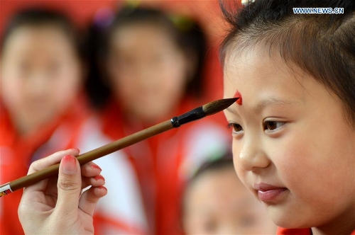 A child is painted with a red point on the forehead, a ceremony to open skyeyes for children, at the Longtaitou Festival in Yiyuan County, east China's Shandong Province, March 10, 2016. The Longtaitou Festival, or Eryueer Festival, which means "dragon raises head" in Chinese, is a traditional Chinese festival held on the second day of the second month in the Chinese lunar calendar. (Xinhua/Zhao Dongshan)