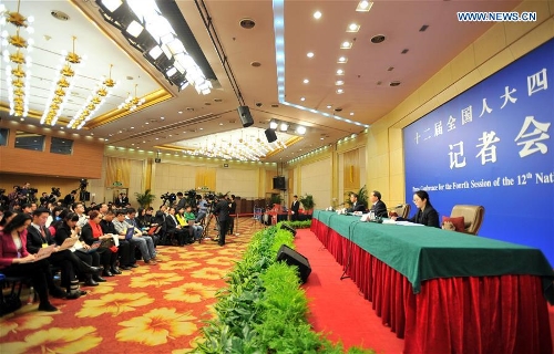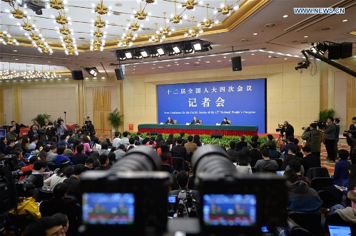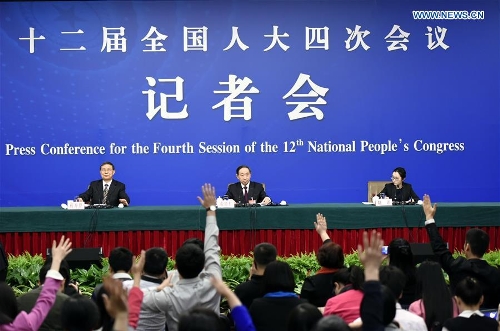 Chinese Education Minister Yuan Guiren (C, back) gives a press conference about the reform and development of China's eduaction on the sidelines of the fourth session of China's 12th National People's Congress in Beijing, capital of China, March 10, 2016. (Xinhua/Chen Yichen)