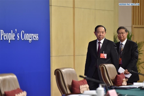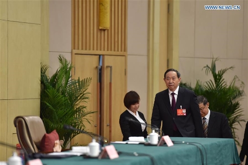 Chinese Education Minister Yuan Guiren (front) arrives to attend a press conference about the reform and development of China's education on the sidelines of the fourth session of China's 12th National People's Congress in Beijing, capital of China, March 10, 2016. (Xinhua/Li Xin)