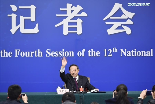 Chinese Education Minister Yuan Guiren greets journalists before a press conference about the reform and development of China's education on the sidelines of the fourth session of China's 12th National People's Congress in Beijing, capital of China, March 10, 2016. (Xinhua/Chen Yichen)