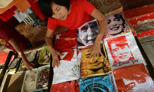 A vendor displays various shirts bearing the portrait of Myanmar democracy icon Aung San Suu Kyi with slogans "freedom to lead" and "our leader" at the headquarters of the National League for Democracy party in Yangon on Thursday. Photo: AFP