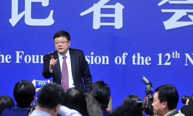 Chen Jining, China's minister of environmental protection, addresses reporters on Friday at a press conference in Beijing on the sidelines of the annual sessions of the country's top legislative and advisory bodies. Photo: CFP