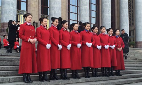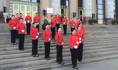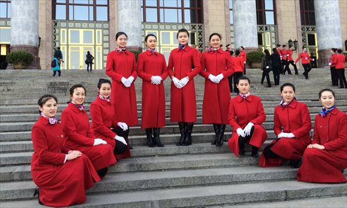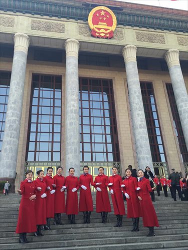 Professional meeting service staff of the 12th National Committee of the Chinese People's Political Consultative Conference (CPPCC) pose for group photos at the Great Hall of the People in Beijing on March 14, 2016.