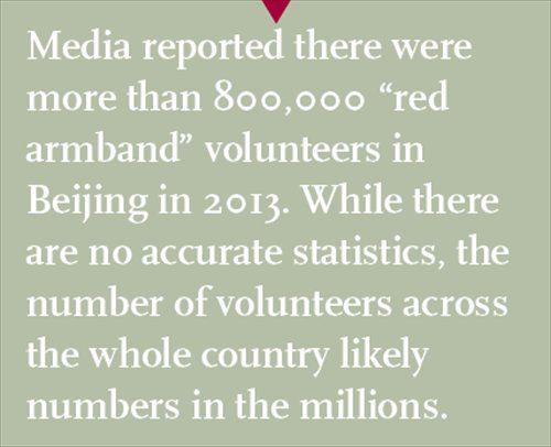According to a media report, in 2013, there were more than 800,000 "red armband" volunteers in Beijing. While there are no accurate statistics, the number of volunteers across the whole country likely numbers in the millions, all of whom report to China's smallest political unit - the neighborhood committee.