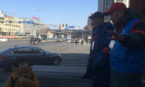 A passerby asks security volunteers for directions. Photo: Xu Ming/GT