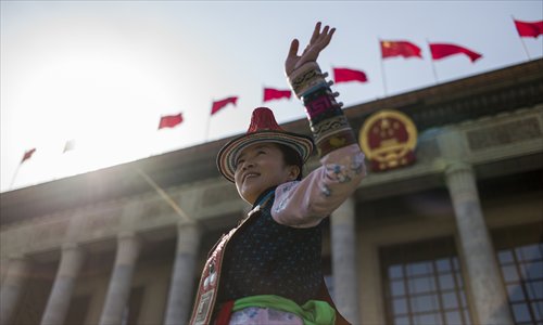 An ethnic minority delegate waves at journalists during the closing session of the National Committee of the Chinese People's Political Consultative Conference (CPPCC) at the Great Hall of the People in Beijing on Monday. Photo: AFP