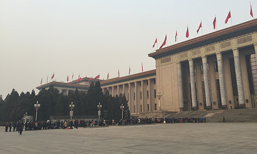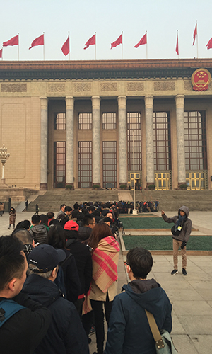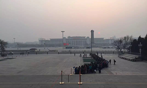Reporters stand in queue in the early morning on March 16 in front of the Great Hall of the People to attend the press conference of Premier Li Keqiang. Some reporters even have been waiting there since 11 pm the night before the conference. Photo: Fan Lingzhi/GT
