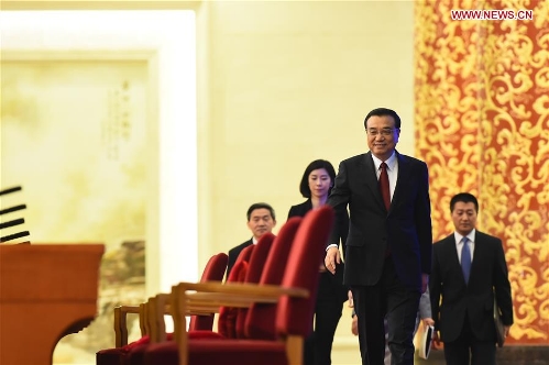 Chinese Premier Li Keqiang (front) arrives for his press conference after the closing meeting of the fourth session of China's 12th National People's Congress at the Great Hall of the People in Beijing, capital of China, March 16, 2016. (Xinhua/Jin Liangkuai)