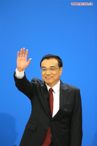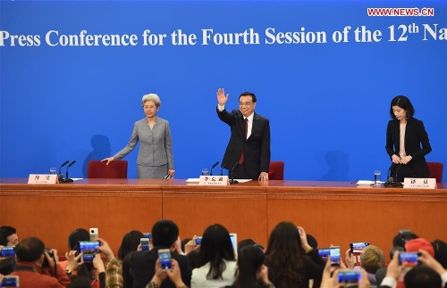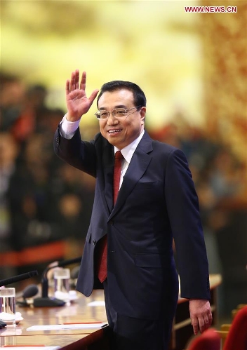 Chinese Premier Li Keqiang greets journalists at his press conference after the closing meeting of the fourth session of China's 12th National People's Congress at the Great Hall of the People in Beijing, capital of China, March 16, 2016. (Xinhua/Lyu Xun)
