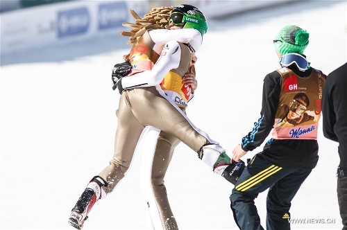 Robert Kranjec (L) of Slovenia wearing an eagle's mask embraces his teammate Peter Prevc after Prevc's victorious jump in the second round of the FIS Ski Jumping World Cup final competition in Planica, Slovenia, March 20, 2016. The FIS Ski Jumping World Cup ended with the final four competitions on Sunday. (Xinhua/Luka Dakskobler)