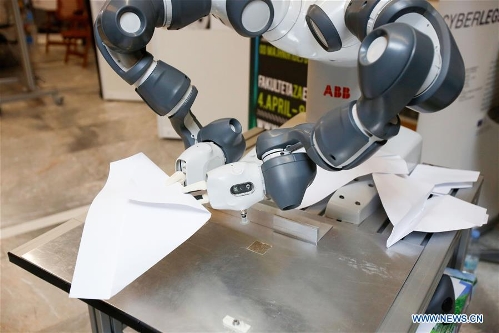 A Slovenian robot makes paper planes at the European Robotics Forum 2016 at Cankarjev Dom Cultural and Congress Center in Ljubljana, Slovenia, March 22, 2016. The 7th European Robotics Forum with the theme "Robots and Jobs" is held from March 21 to 23 in Ljubljana. It hosts about 500 particpants and features 60 workshops and 22 exhibitions. The forum aims to explore how robotics can help boost economic growth, create jobs, and enrich human lives. (Xinhua/Luka Dakskobler)