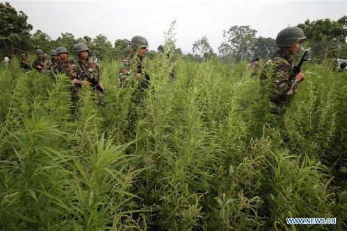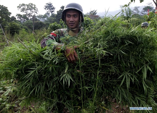 Indonesian soldiers take part in an operation to destroy 189 hectares of marijuana fields in Aceh province, Indonesia, April 1, 2016. Indonesia has some of the world's toughest anti-narcotics laws and people caught smuggling more than five grams of some controlled substances can be sentenced to death. (Xinhua/Junaidi)