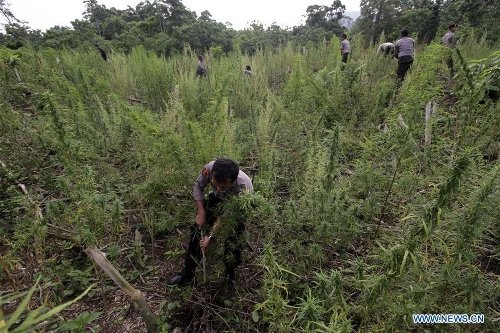 Indonesian police officers take part in an operation to destroy 189 hectares of marijuana fields in Aceh province, Indonesia, April 1, 2016. Indonesia has some of the world's toughest anti-narcotics laws and people caught smuggling more than five grams of some controlled substances can be sentenced to death. (Xinhua/Junaidi)