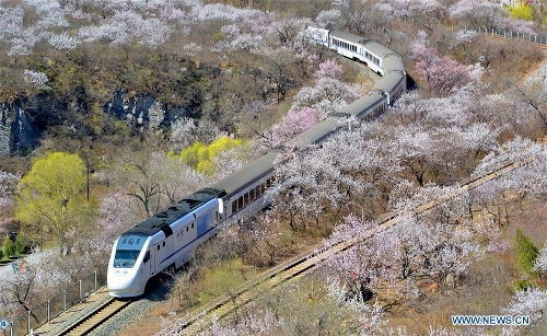 A train runs through a field of flowers near the Juyongguan Pass of the Great Wall in Beijing, capital of China, April 1, 2016. (Xinhua/Yang Baosen)