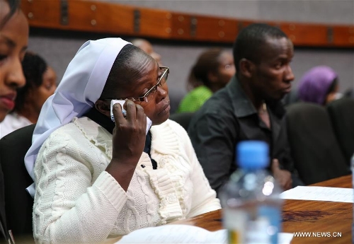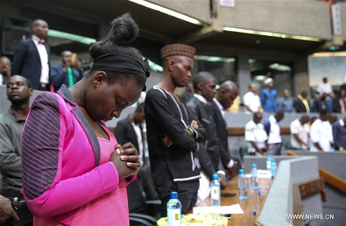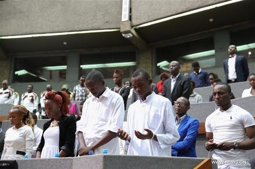 People mourn victims during the first anniversary commemoration of the terror attack in Kenya's Moi University campus in Garissa in Nairobi, Kenya, on April 2, 2016. The Al-Shaabab militants attacked Moi University campus in Kenya's Garissa and killed 148 people on April 2, 2015. (Xinhua/Pan Siwei)