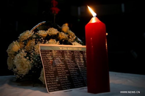 The list of victims is seen during the first anniversary commemoration of the terror attack in Kenya's Moi University campus in Garissa in Nairobi, Kenya, on April 2, 2016. The Al-Shaabab militants attacked Moi University campus in Kenya's Garissa and killed 148 people on April 2, 2015. (Xinhua/Pan Siwei)