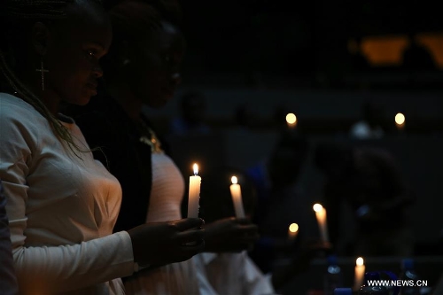 People hold candles to mourn victims during the first anniversary commemoration of the terror attack in Kenya's Moi University campus in Garissa in Nairobi, Kenya, on April 2, 2016. The Al-Shaabab militants attacked Moi University campus in Kenya's Garissa and killed 148 people on April 2, 2015. (Xinhua/Pan Siwei)
