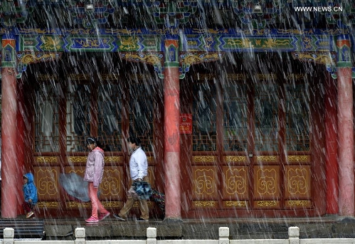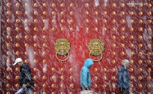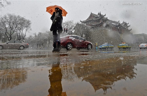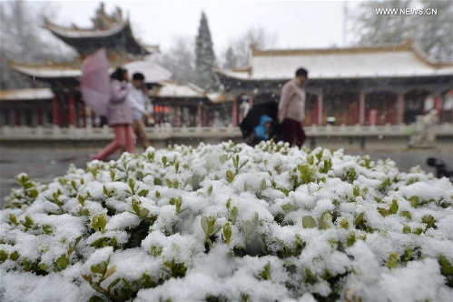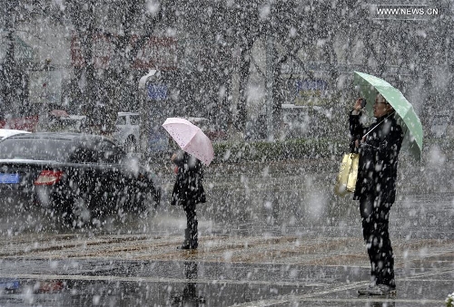Pedestrians walk in snow in Yinchuan, capital of northwest China's Ningxia Hui Autonomous Region, April 2, 2016. Snowfall hit the city on Saturday, causing inconvenience for local residents. Photo: Xinhua