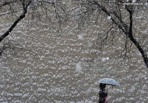 A pedestrian walks in snow with an umbrella in Yinchuan, capital of northwest China's Ningxia Hui Autonomous Region, April 2, 2016. Snowfall hit the city on Saturday, causing inconvenience for local residents. Photo: Xinhua