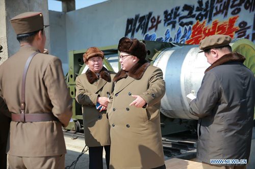 Photo provided by Korean Central News Agency (KCNA) on March 24, 2016 shows the top leader of the Democratic People's Republic of Korea (DPRK) Kim Jong Un guiding a ground test for heavy-lift, solid-fuel rocket engine and its separation. The top leader of the Democratic People's Republic of Korea (DPRK) Kim Jong Un has guided a ground test for heavy-lift, solid-fuel rocket engine and its separation, the country's official news agency KCNA reported Thursday. The test was aimed at testing the structural safety and the thrust of the newly developed rocket engine and gauging the working specification of heat separation system, said KCNA. (Xinhua/KCNA)