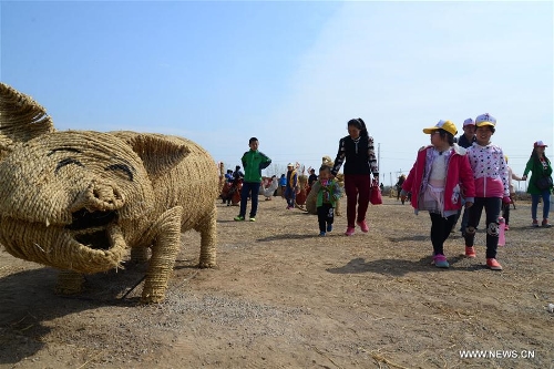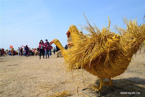 Tourists view straw works during a straw arts festival in Gaoqing County, east China's Shandong Province, April 3, 2016. Photo: Xinhua