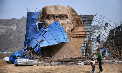 Crews in Shijiazhuang, Hebei Province began dismantling the fake monument on April 2. Photos show a severed Sphinx head being surrounded by walls of sheet metal and rebar.