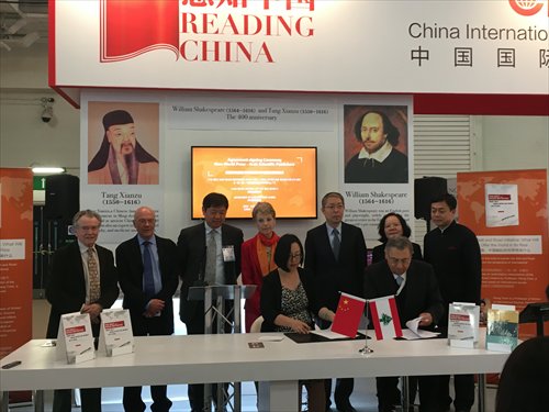 Representatives from the New World Press and Arab Scientific Publishers Inc attend a partnership signing ceremony at the London Book Fair 2016 in the UK on Tuesday. Photo: Courtesy of China International Publishing Group