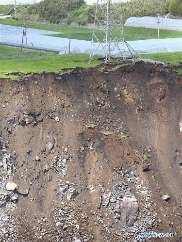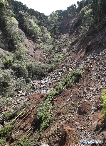 KUMAMOTO, April 17, 2016 (Xinhua) -- Photo taken on April 17, 2016 shows a landslide after an earthquake in Minami-Aso, Kumamoto prefecture in southwest Japan, on April 17, 2016. A powerful magnitude-7.3 earthquake struck the island of Kyushu in southwest Japan early Saturday just a day after a sizable foreshock hit the region, with the number of fatalities now standing at 41 according to the latest figures on Sunday. (Xinhua/Liu Tian)
