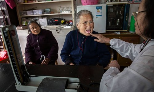 Volunteer doctor Li Laifeng (right) examines the health of an old woman. Photo: CFP
