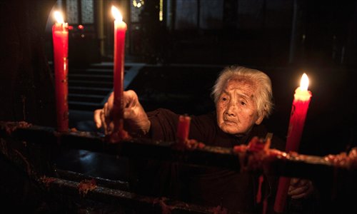 An elderly woman lights candles for morning prayer. Photo: CFP