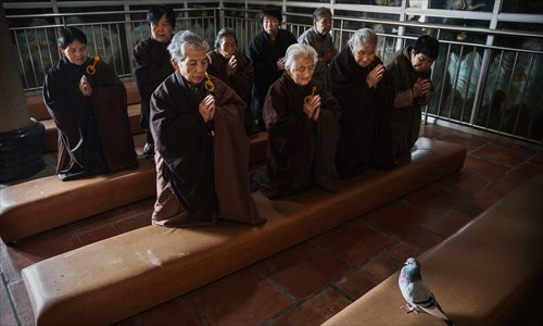 Residents of Jixiang Temple nursing home in Shaxian, Fujian Province, pray before a meal. Photo: CFP