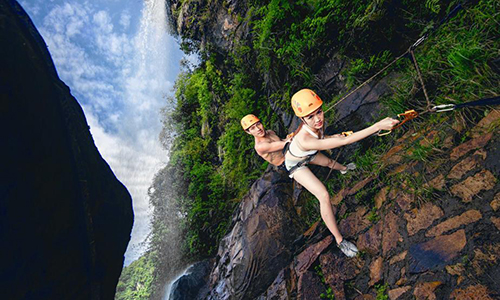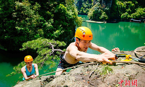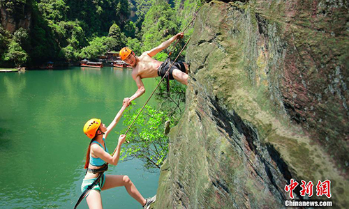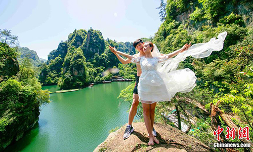 A woman accepts her boyfriend's romantic marriage proposal in a picture-perfect cliff side over Baofeng Lake in Zhangjiajie, central China's Hunan province on April 23. Photo: CNS/Li Dongqun