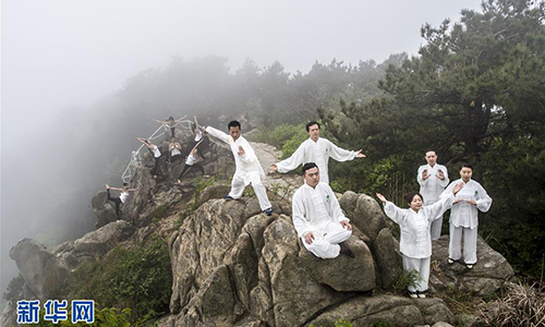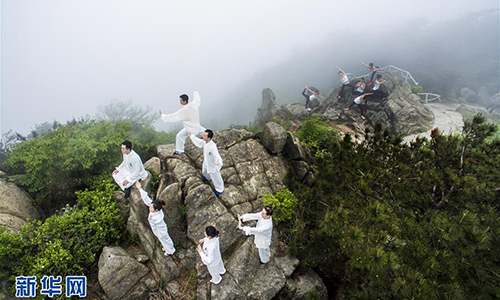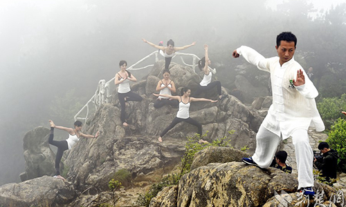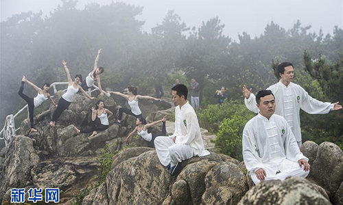 Yoga lovers together with Tai Chi enthusiasts give a performance on the Shuangfeng Mountain in Xiaogan, central China's Hubei province, April 24, 2016. The performance is not only an exchange of culture of health preserving, but also promotes a healthy lifestyle to the public. Photo: Xinhua