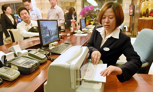 A staff member prepares a value-added tax (VAT) invoice for guest at Fuzhou Hotel in Fuzhou, capital of southeast China's Fujian Province, May 1, 2016. VAT refers to a tax levied on the difference between a commodity's price before taxes and its production cost. Business tax refers to a levy on a business's gross revenues. The VAT began in 2012 to replace business tax in certain industries, as a major step in China's structural reform. Starting from May 1 this year, the replacement was extended to construction, real estate, finance and consumer services to avoid double taxation. (Xinhua/Li Shanchuan)