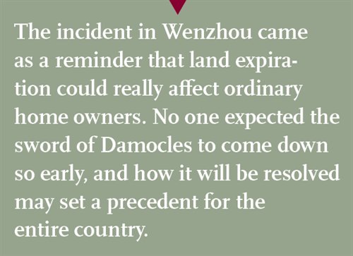 But the incident in Wenzhou came as a reminder that land expiration could really affect ordinary home owners. No one expected the sword of Damocles to come down so early, and how it will be resolved may set a precedent for the entire country.